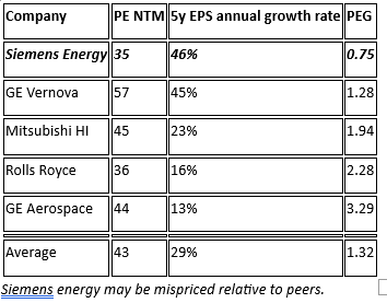 The wind division, Siemens Gamesa, remains a risk and the turnaround is not fully complete. However, even with that overhang, Siemens Energy is trading at a discount to its direct peers GE Vernova and Mitsubishi Heavy Industries.